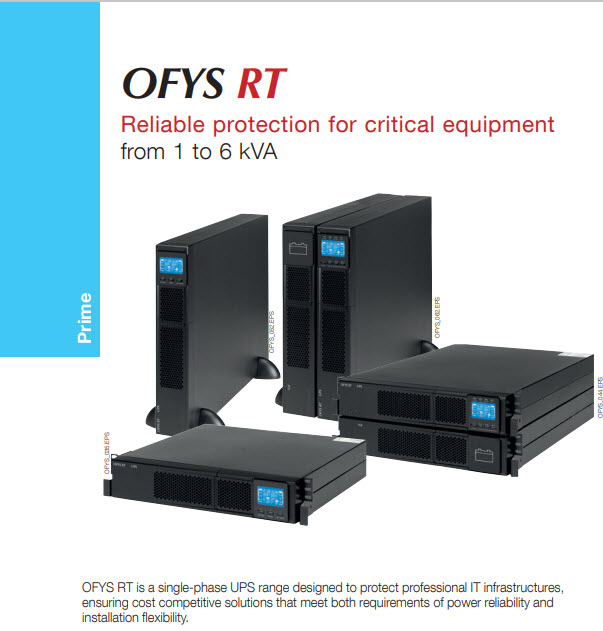 OFYS RT е гама от мононофазни UPS, предназначени за защита на професионални ИТ инфраструктури, осигуряване на ценово конкурентни решения, които отговарят както на изискванията за надеждност на захранването, така и на гъвкавост на инсталацията.